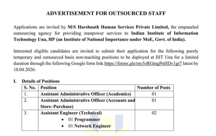 यह भर्ती non-teaching पदों के लिए है और इच्छुक उम्मीदवार ऑनलाइन Google Form के माध्यम से आवेदन कर सकते हैं। आवेदन की अंतिम तिथि 10 अप्रैल 2026 निर्धारित की गई है।