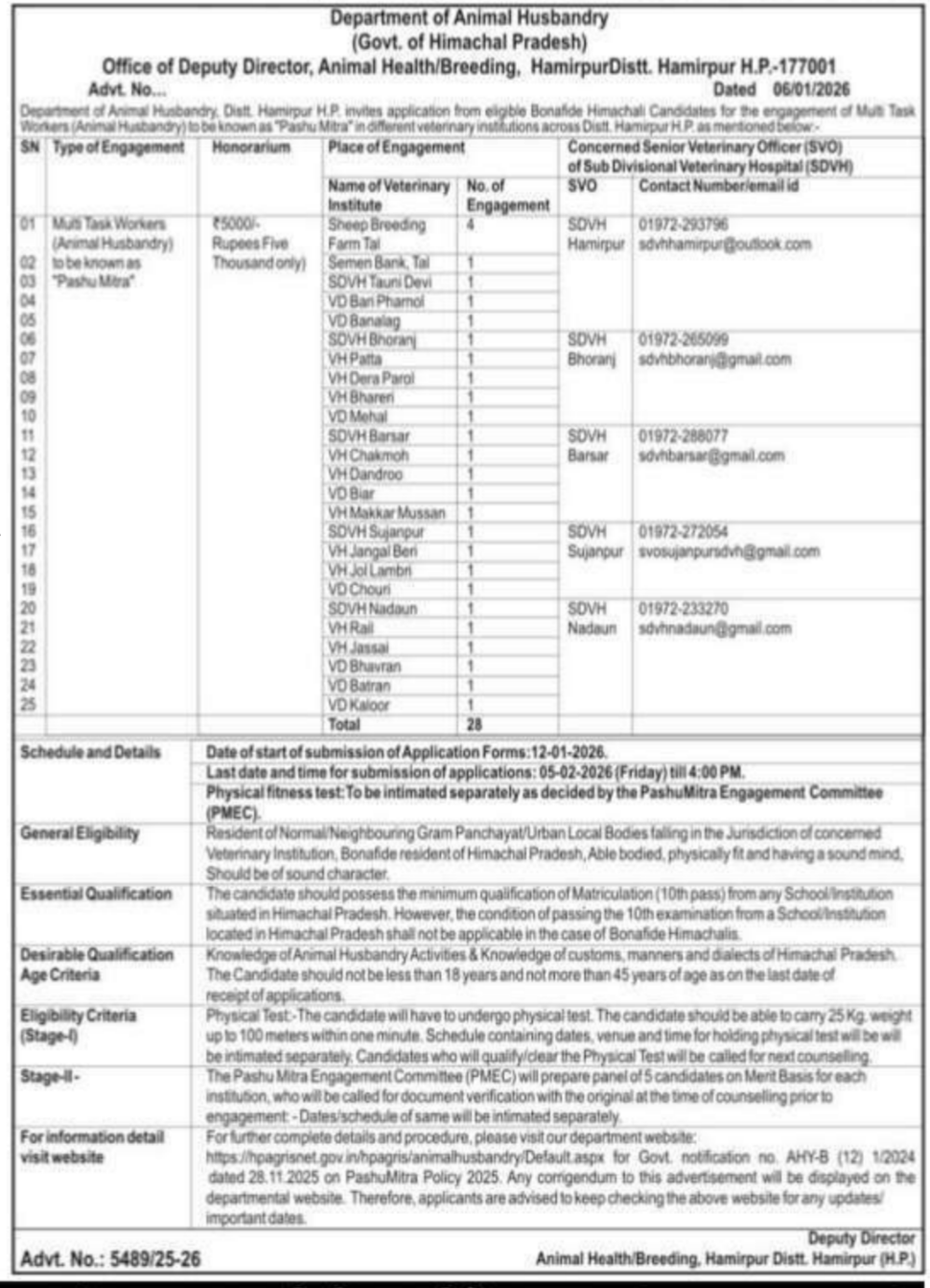Himachal Pashu Mitra Recruitment 2026 in Hamirpur for 10th Pass: Himachal Pradesh Animal Husbandry Department ने District Hamirpur में Multi Task Worker (Pashu Mitra) के 28 पदों पर भर्ती के लिए ऑफिशियल नोटिफिकेशन जारी कर दिया है। यह भर्ती Part Time (दिन में 4 घंटे) आधार पर की जाएगी और 10वीं पास उम्मीदवारों के लिए अच्छा मौका है।